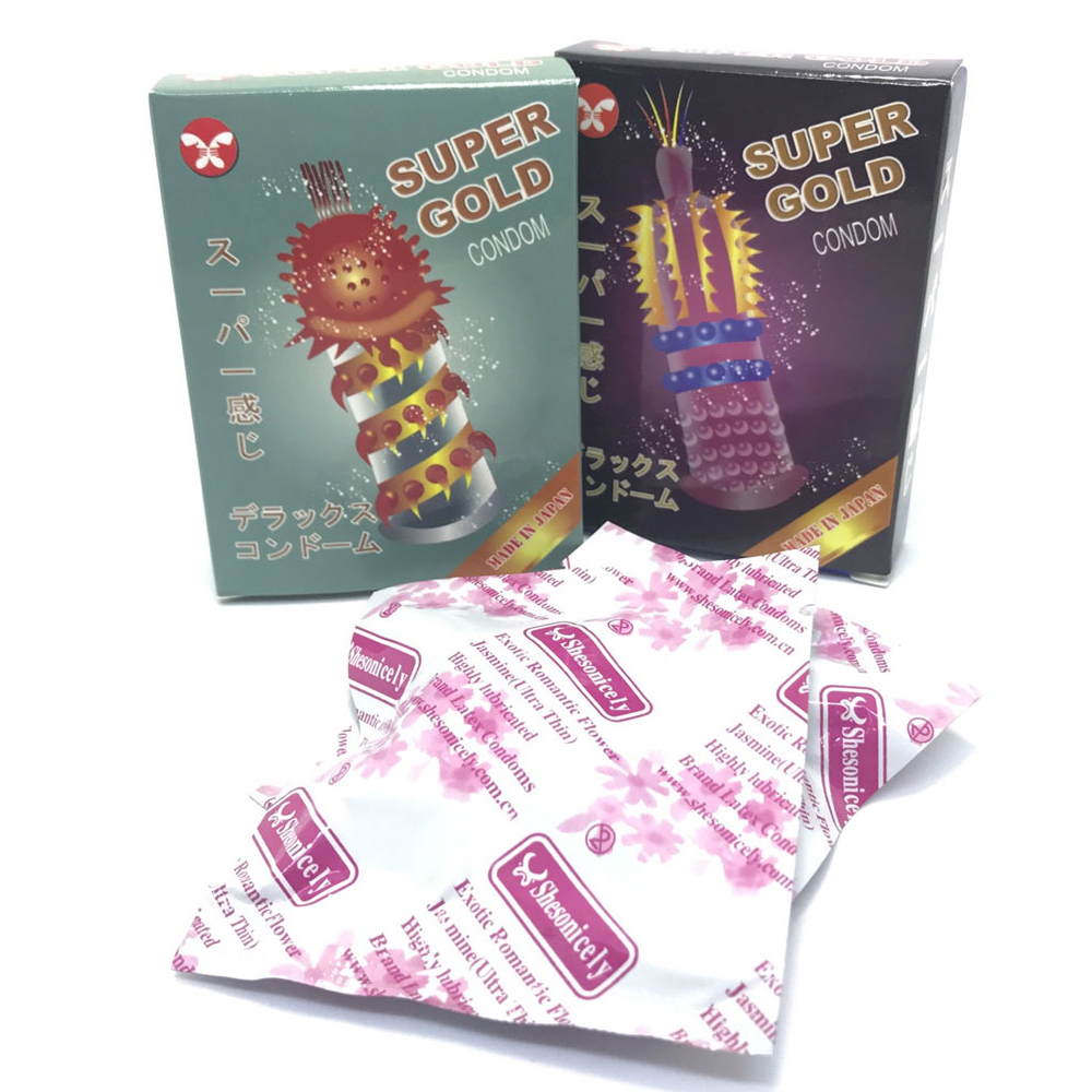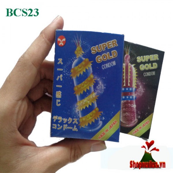 - Bao cao su super gold được thiết kế với có 6 kiểu dáng khác nhau: gai vòng, bi dọc, gân nổi lượn sóng quanh thân bao kết hợp với gel bôi trơn tăng cường ngoài bề mặt của thân bao
